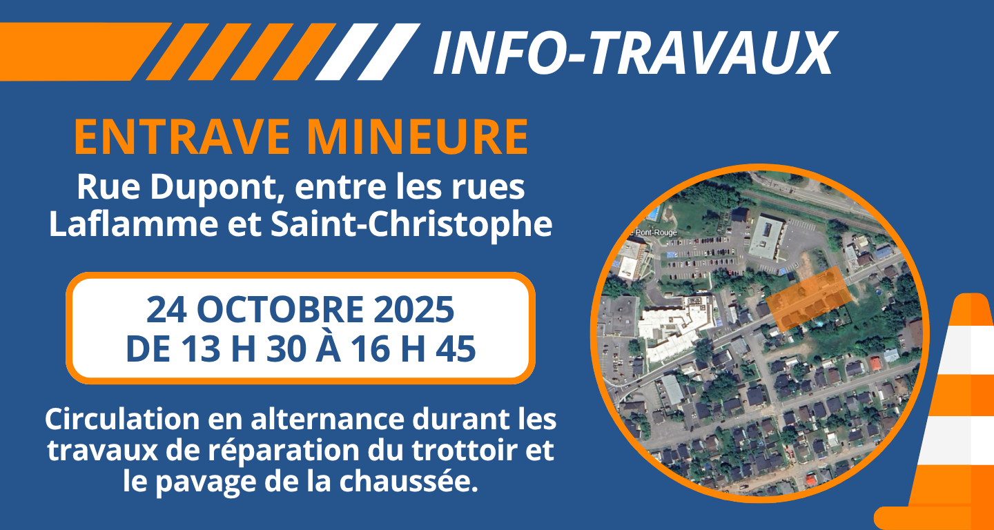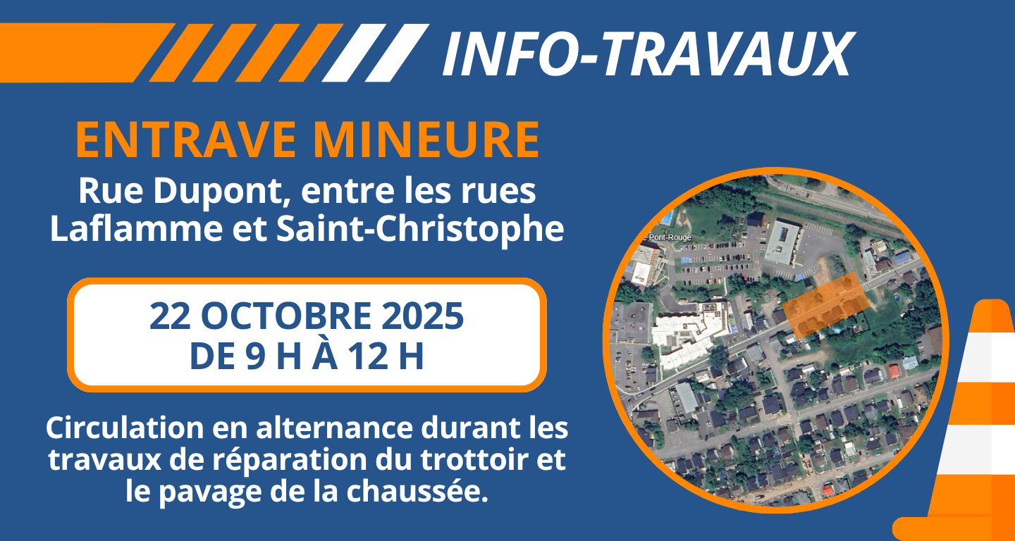 Publié le 20 octobre 2025L’une des voies de circulation de la rue Dupont, entre les rues Laflamme et Saint-Christophe, sera fermée le mercredi 22 octobre 2025, de 9 h à 12 h, ainsi que le vendredi 24 octobre, de 13 h 30 à 16 h 45, pour permettre la réparation du trottoir et le pavage de la rue à la suite des travaux de raccordement. La circulation se fera par alternance durant les travaux.