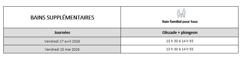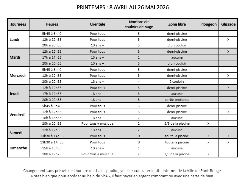 La piscine sera ouverte selon l’horaire en vigueur lorsque la température extérieure se situe au-delà de 16 °C, sauf s’il y a une forte pluie, un orage ou lors d’une journée complète de précipitations. En période de chaleur extrême, les heures d’ouverture peuvent être prolongées.