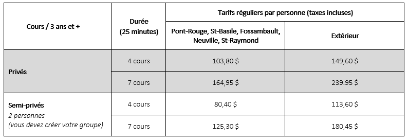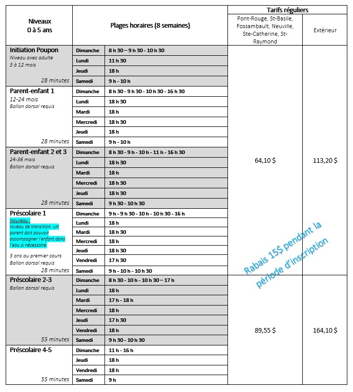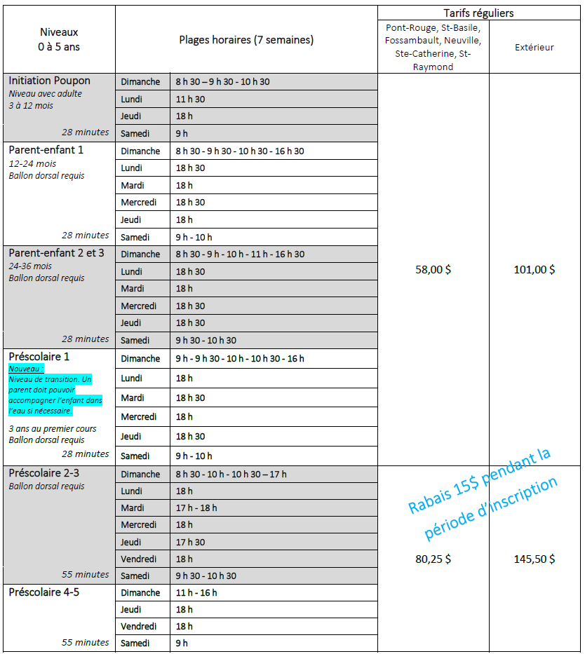 - Si vous doutez du niveau, il est préférable de faire évaluer les habiletés de l’enfant pour éviter d’avoir à changer de plage horaire et de ne pas avoir votre place dans le groupe requis.
