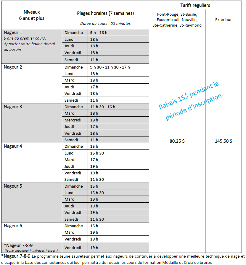 - Un rabais de 20,80 $ par personne sera soustrait pour un 2e cours par semaine et 31,70 $ pour un 3e cours par semaine. Ce rabais s’applique uniquement pour une inscription faite avant le début du cours.