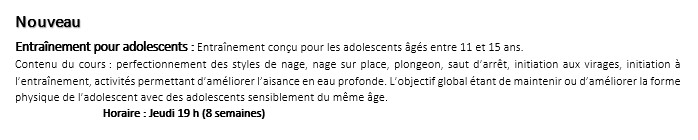 Ce cours est proposé aux adultes qui désirent apprendre et perfectionner les techniques de nage. Les participants doivent savoir nager au minimum 25 mètres en continu et être à l’aise dans la partie profonde car le cours est offert en longueur.