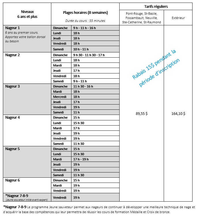 - Pour profiter du rabais de 15 $ applicable aux inscriptions de natation, vous devez faire l’inscription et le paiement pendant la période d’inscription.