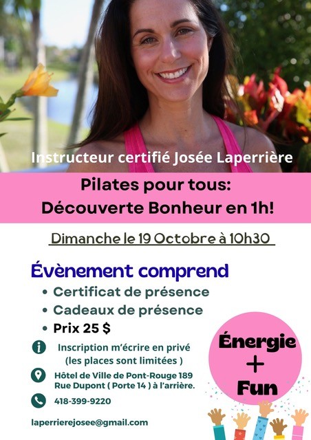Note sur l’enseignante :Josée Laperrière, professeure de Pilates et de Yoga depuis 15 ans et passionnée de fitness désire partager avec vous sa passion pour ces disciplines.