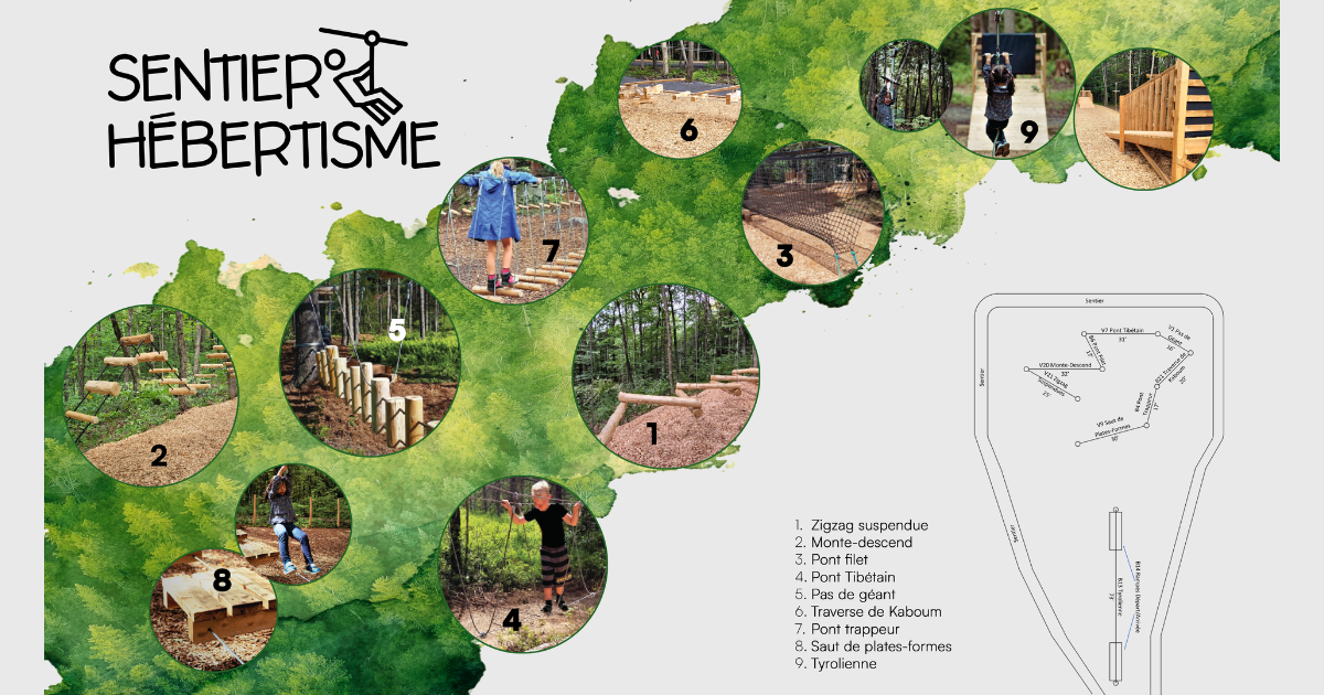 Parallèlement, un tout nouveau parcours d’hébertisme en forêt est prévu pour l’automne. Composé d’une tyrolienne et de neuf modules d’agilité (ponts suspendus, structures de balance, etc.), ce parcours immersif permettra aux jeunes de circuler entre les arbres dans un environnement stimulant et sécuritaire. Pensé en harmonie avec la nature, il viendra compléter et bonifier l’offre récréative extérieure déjà présente sur le site au parc du Verger.