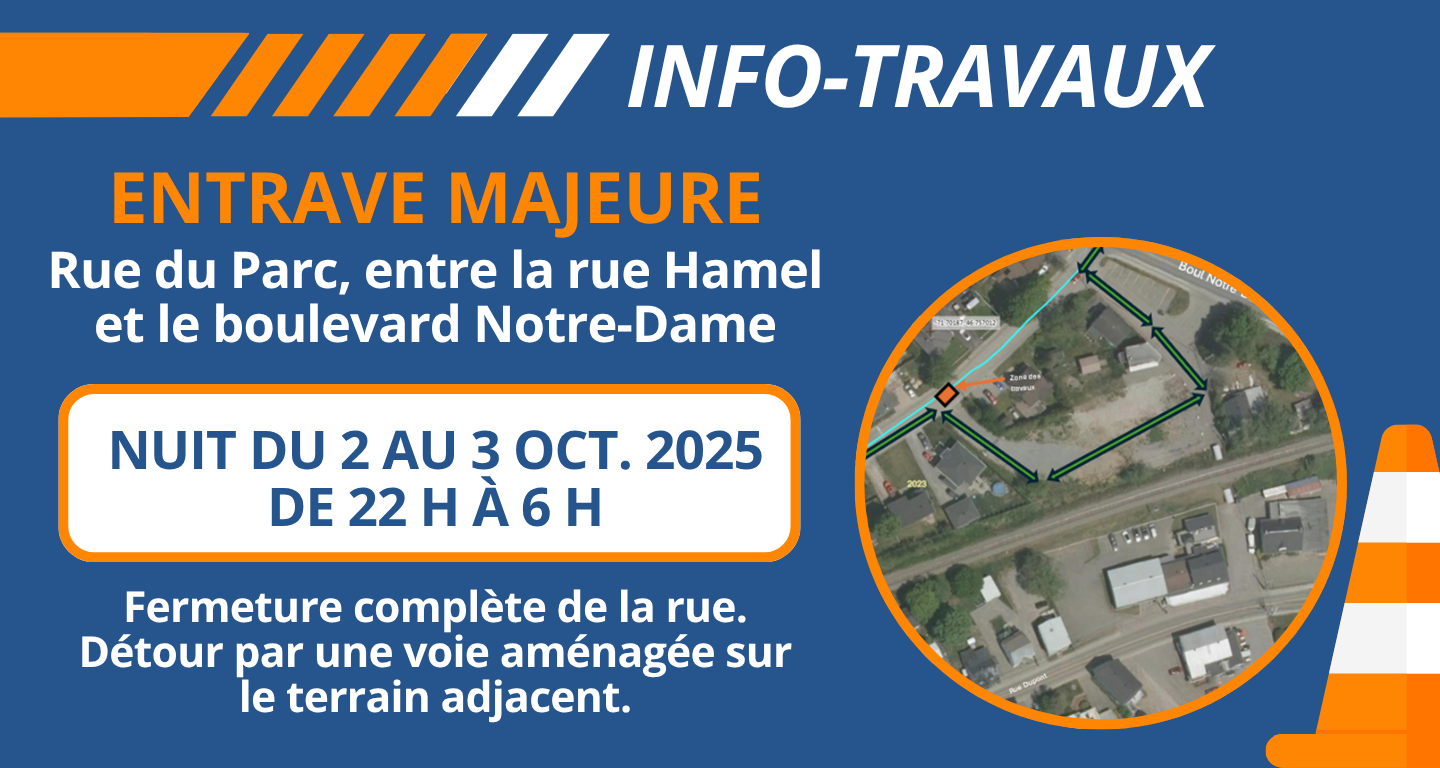 [INFO-TRAVAUX] La rue du Parc, entre la rue Hamel et le boulevard Notre-Dame, sera fermée temporairement dans la nuit du 2 au 3 octobre 2025, de 22 h à 6 h, pour permettre des travaux de raccordement. Lire la suite.