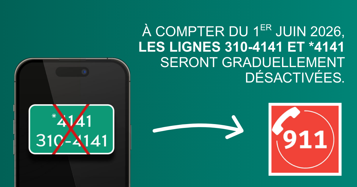Dans le cadre de la transition vers le réseau 9-1-1 de prochaine génération, la Sûreté du Québec amorcera, au cours des prochains mois, le retrait progressif des lignes téléphoniques 310-4141 et *4141. Ces lignes, encore utilisées pour communiquer avec nos services, reposent sur une technologie désuète et ne répondent plus aux exigences actuelles en matière de communication d’urgence, notamment en ce qui a trait à l’identification et à la géolocalisation des appelants.
